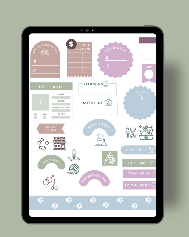 Digital stickers for animal lovers and pet parents! This set includes stickers for appointments, activities, and reminders for pet care tasks. Keep pet duties visually interesting with your choice of six sticker colors to choose from.